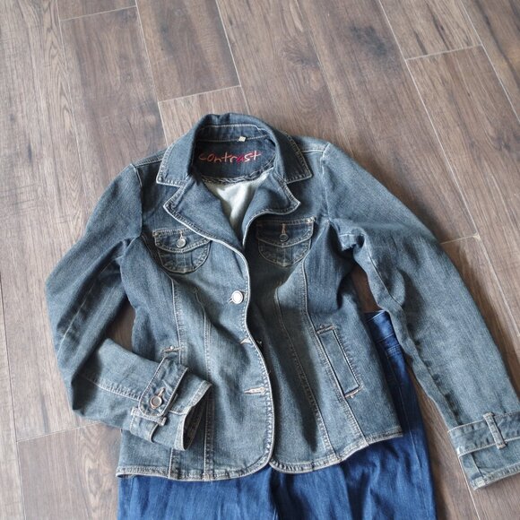 Brand new Ladies jean jacket by Contrast,size small.The jacket has fitted waist,with pockets.Washed look,The Jacket is small pit to pit,is 20" inches across.Length is 22 inches long.