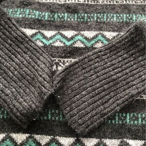 This ladies size medium Kismet sweater features a striking geometric design in black, grey and green, offering a modern twist on classic patterns. The pullover style is enhanced with ribbed knit cuffs and hem, ensuring a comfortable and snug fit. Perfect for adding a touch of sophistication to your wardrobe. The sweater can be worn with the neck up or it pulled down to expose your shoulders. Also a blouse underneath would really set this fair-isle sweater off. If this sweater has been work , it has only being worn once or twice. Sweaters with blouses underneath them , not tucked in seem to be in style this year, this one would be perfect, please check pics out.