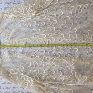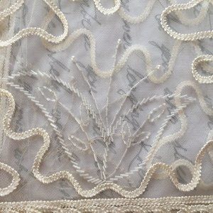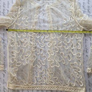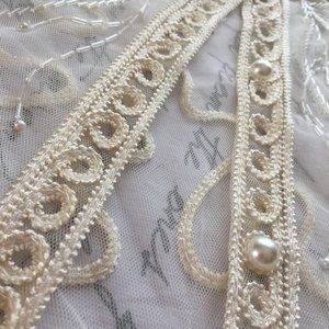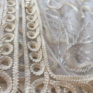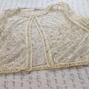 Beautiful laced beaded jacket for those formal occasions. Look dressed up by throwing it over almost anything. Slacks and a turtleneck with a nice pair of shoes, you can't go wrong. Like new. Ivory colour for a vintage look.