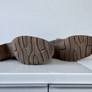 Cream sherpa lining around ankle and on tongue with brown fleecy inner lining