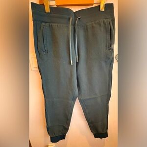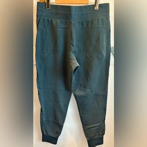 Comfortable dark green jogger pants with drawstring waist and side pockets.