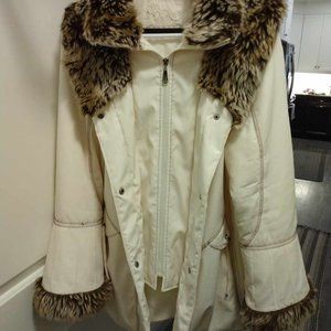 Marcona Coat, Ladies SIze Large, Fur Trimmed in a creamy, off white color, Washable, Beautiful Condition, Like New