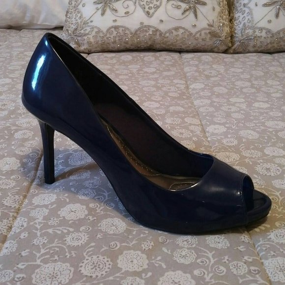 Elegant ladies midnight blue patent peep-toe pumps.