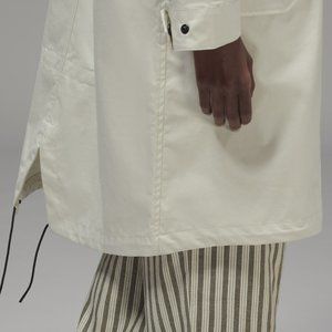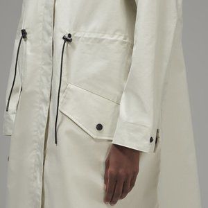 Oversized parka shell with adjustable hood and drawstring waist. Use as a layering piece. Water and wind resistant.
