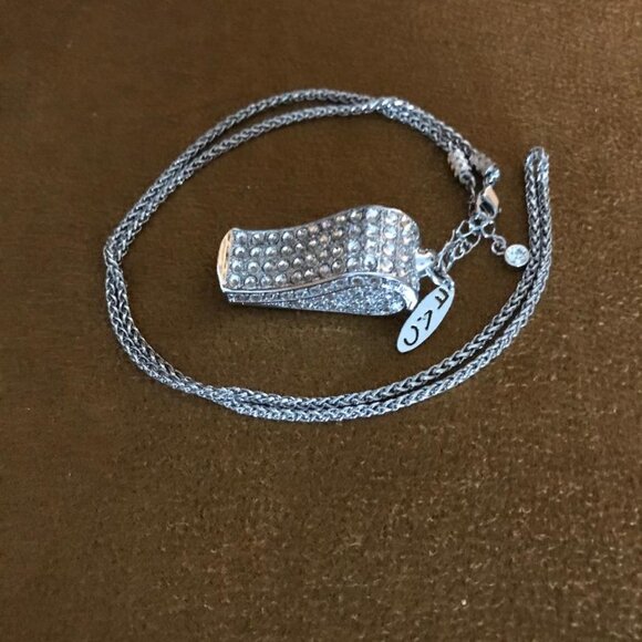 In original shiny condition, never worn and no missing stones. It is made by FAC and was purchased at a Home Jewelry show. This whistle is Beautiful, functional., and well made. Comes on a beautifully detailed shiny silver chain with one larger hanging rhinestone, and the FAC tag. Covered with rhinestones, would make a great gift, and you never know if you will need it.