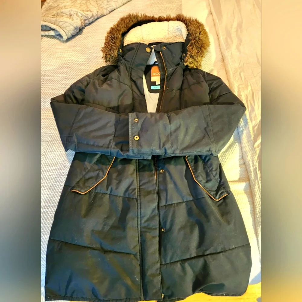 Dark blue Roxy coat. Worn one season. In good shape, except it needs a new zipper. Fur hood. Very warm
