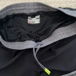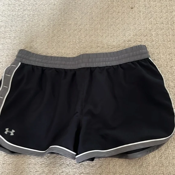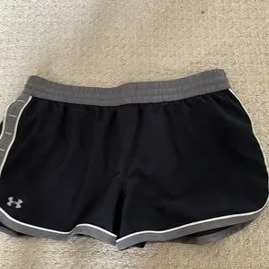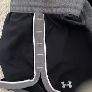 Ladies Under Armour shorts in size Small. Tie waist band. Black grey and white. Has a stitched in panty. These are like new