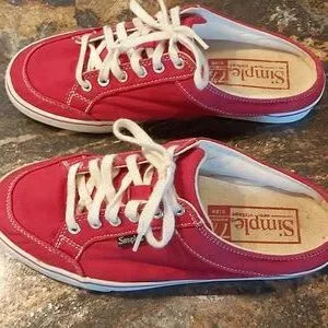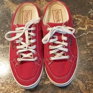Women's size 7.5 Simple red canvass mules. Great condition, only worn once (wishful thinking that I could squish my size 8 foot in a 7.5... not so much). Just the typical minor scuffs on the white soles from banging around in the closet, I have been told a magic eraser works wonders. From a smoke-free, cat-free home.