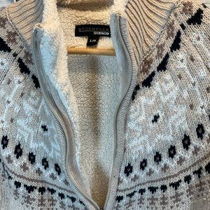 Ladies Size Large - Beige/Black/White Fleece Lined Geometric Print Knit Sweater