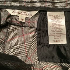 Black and white with a bit of red pinstriping, fit lower on the hips a little bit, comfortable. Gently worn in good condition.