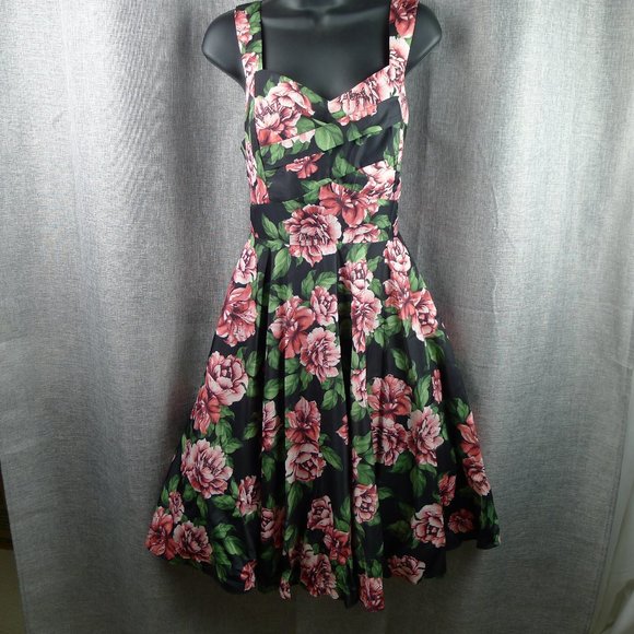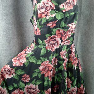 - black, pink and green floral fit and flare dress