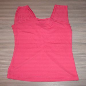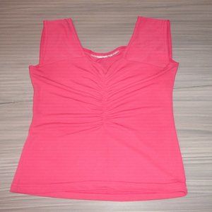 Pink nylon top with gathered elastic at the front for effect, sleeveless.