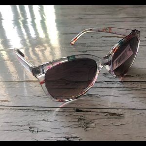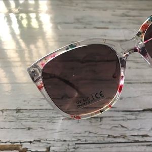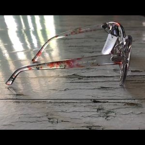 Ladies abstract floral sunglasses. Clear frames with pink and blue accents.