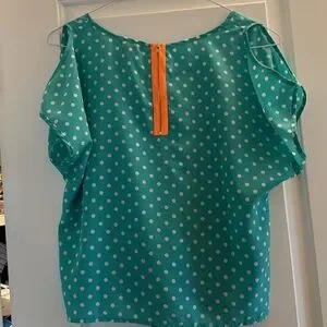 Fun open shoulder top, front tie, peachy orange back contrasting zipper.