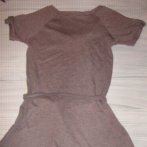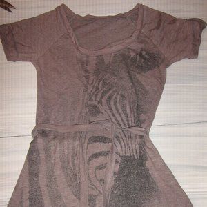 Ladies long brown /grey cotton top with a tie belt. There is a design on the front of the top in black. Short sleeves with cuffs.
