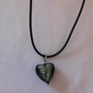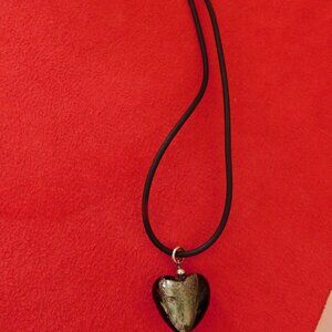 The necklace has a black leather cord and the heart shaped