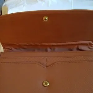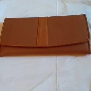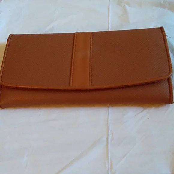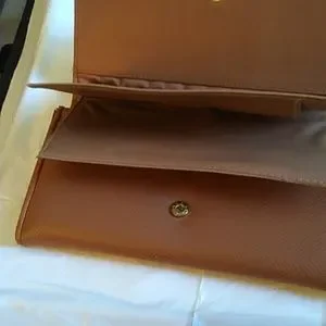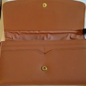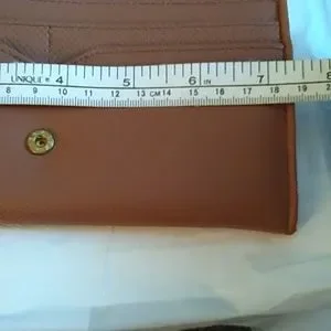 This is a new ladies wallet. It has a pullout compartment that has three slots. It has one outer slot and four inside slots with two card compartment. One inner compartment has a zipper closure. This item is new, tag came off.