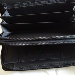 This is a large ladies wallet. This wallet has one zipper outside pocket, two seperate compartment with zipper closure. one compartment has five separate slots for bills, the other side has nine card holder, five bill compartment and a photo ID holder. This is very roomy and very new. This wallet is made Polyurethane Foam. Never used.