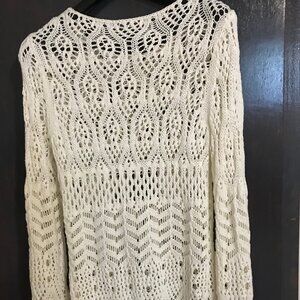 Long sleeved top in a cotton crocheted design, with a scalloped edge at the hem and sleeves, The length of the top is 30".