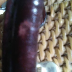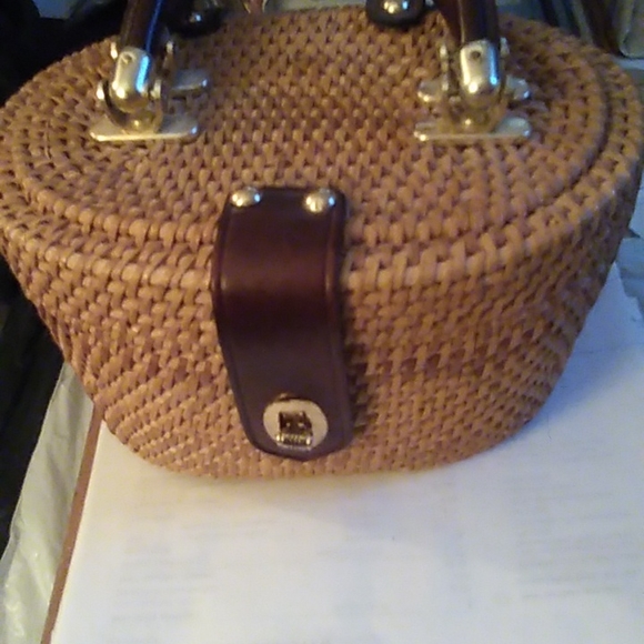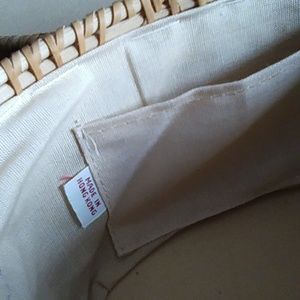 This is a wicker type ladies handbag, 8 1/2" x 5". This bag is very elegant and classy, and is ready for any occasion. This hand bag/basket has a snap closure and is lined on the inside with a single pocket. This bag is tan in color. This item was used once, however, a pen was left inside and some markings are present. No Return.
