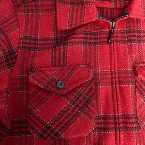 Super Cool traditional plaid zip front shacked in a lovely shade of deep claret red. Durable, quality fabric is 80% wool and 20% nylon. Perfect as a light jacket or layered over a sweater for colder weather. It is in excellent condition and does not show any signs of having been worn. Fits in perfectly with western styling