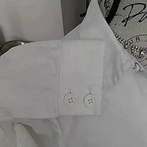 55% linen and 45% cotton. 5 buttons front, 2 buttons on sleeves, pit to pit 19", neck to back bottom seam 24".