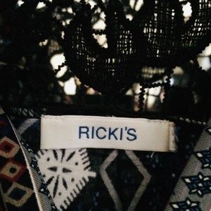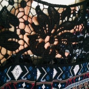 Ladies geometric blouse with Black lace across back shoulders size Medium