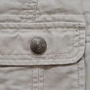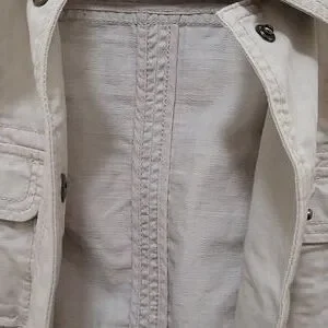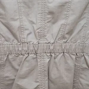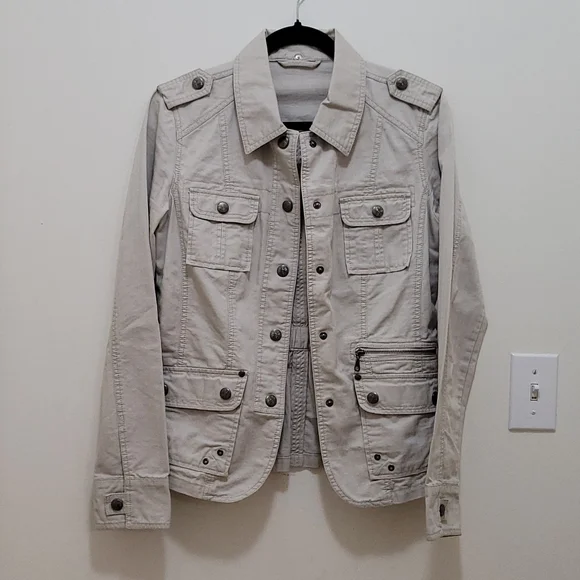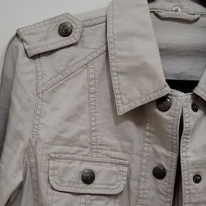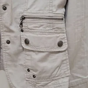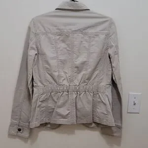 Ladies cotton military jacket with elastic waist band and lots of details.