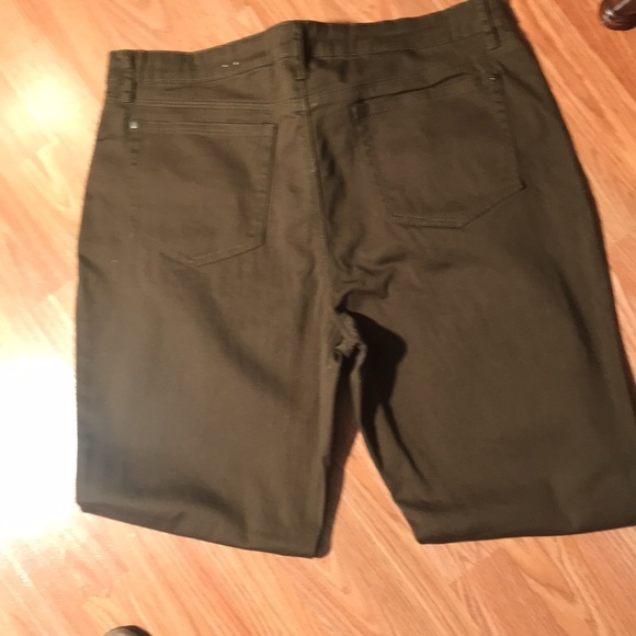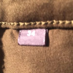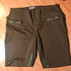 Army green pants with leather like trim on the pockets and inner legs. In excellent condition. Never worn