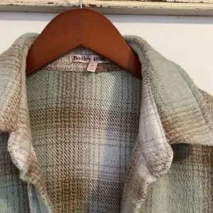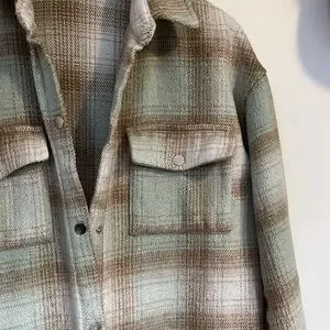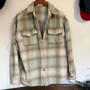 Gently used ladies plaid shacket in mint green, brown and cream. Size ladies medium excellent used condition. Oversized fit