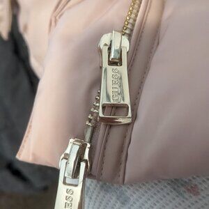 Peachy pink warm winter jacket with gold zipper and 2 zipper pulls. Fur hood trim. Excellent almost perfect condition. Only flaw I can see is the tiniest bit of wear on zipper pull. See pics. Bought new from Guess and worn for one winter. Size xs and very cozy. Inside there is a vest attached. Classy and elegant looking.