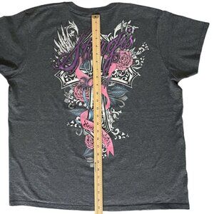 Front of shirt has a winged cross with pink roses and blue leaves, with "Sturgis" in purple metallic foil.