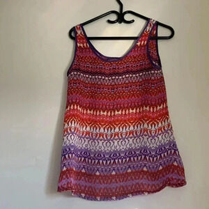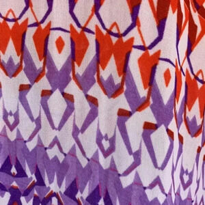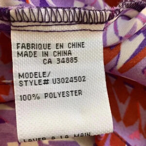 This lightweight top will be great for summer! Bright summer colours, decorative buttons down the front and purple trim.