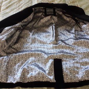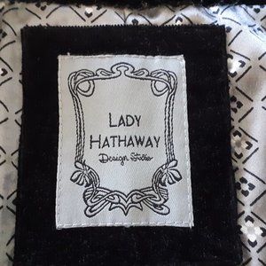 Black jacket, Lady Hathaway Design Studio, Size M, very fine corduroy, two pockets with flaps, two metal buttons down front, 3 metal buttons on each sleeve, 1 metal button on each pocket, fully lined. Armpit to armpit 21 inches. Centre back 26.5 inches. Smoke-free home.