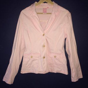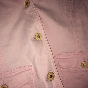 Very gently worn, in perfect condition! Gorgeous baby pink stretchy denim blazer back slit jacket. - Stretchy denim material - All buttons branded 'Lady Hathaway' - Two (2) usable front pockets - Back slit design - 98% Cotton 2% Spandex - Machine wash cold SIZE: Medium COLOUR: Baby Pink / Light Pink