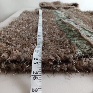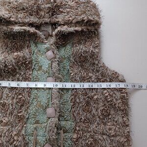 A whimsical hooded vest in soft brown, beige, and blue. The fabric has no stretch. Designed with 3D rosettes, organza contrast, and thread sketched stamen accents. Ideal for fall, winter, and spring layering. Gently worn, great condition.
