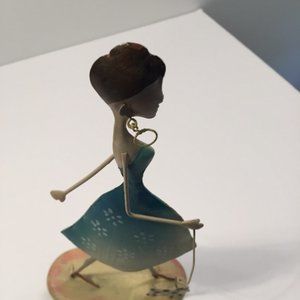Woman in a green dress with white daisies walking her little puppy on a long leash. Painted tin. Earring swings. All other parts are static.