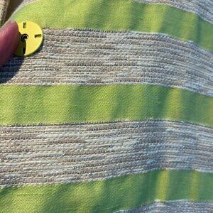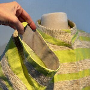 Tags: Slightly oversized vintage blazer jacket coat striped striped lime green tan beige linen mandarin collar snaps tweed high neck boxy lightweight summer spring fall winter nautical stripes boxy neon bright