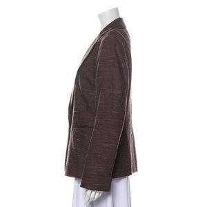 Lovely wool and hemp blend medium weight fabric, fully lined, welt pocket details. Heathered brown subtle tweed or lightly textured weave. Classic and professional.