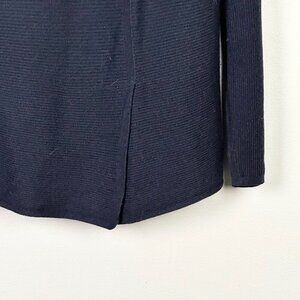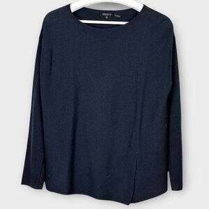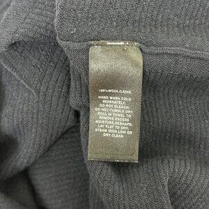 Lafayette 148 Lightweight Wool Crew Neck Sweater Black. Very soft and lightweight. Horizontal ribbing across body. Vertical ribbing down arms. Slightly dropped shoulders. Flat seams down body and arms, and around shoulders. Small split at front. Larger crew neck, almost boat neck. Slightly boxy loose fit. Materials: 100% Wool. No known flaws.