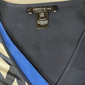 Lafayette 148 Shirt Womens 2X Blue Black Silk Geometric Print Blouse Top Plus