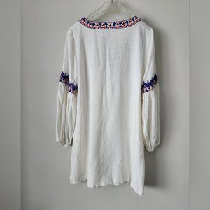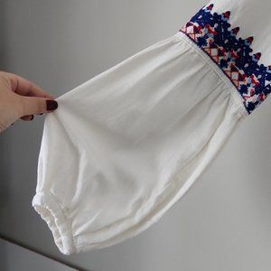Elegant white dress with intricate blue embroidery. Perfect for casual outings or special occasions.