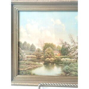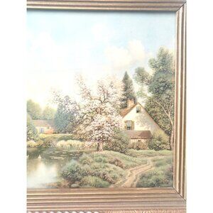 " Lake House with Cherry Blossoms" Framed Print Vintage Stand Included