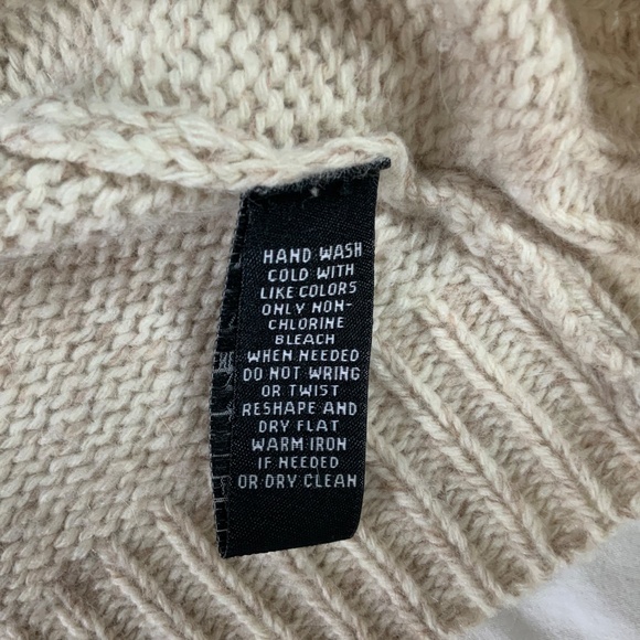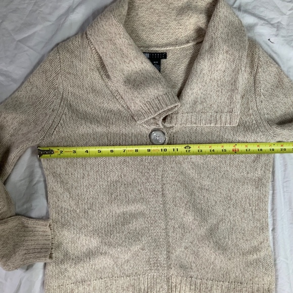 This 80% lambswool, 10% angora, 10% nylon (to help keep its shape) is very soft and in clean, excellent condition. The one-button closure is unique and gives this sweater a soft, slightly boxy, feel that drapes nicely.
