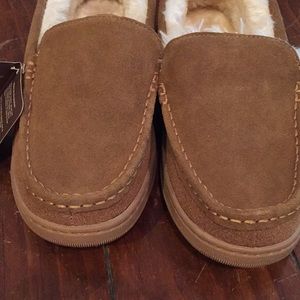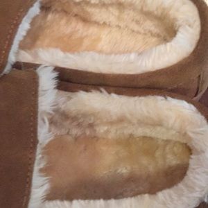 Never worn suede moccasins with manmade faux fur lining in good condition. Very comfortable and soft. Rubber soles.