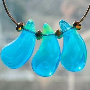Feel Beautiful Everyday with these unique turquoise lampwork teardrop beads. Nestled in between are Czech crystal rondelles. Measurements: 16mm / 2 1/2" long x 3mm / 1 1/4" wide Weight: 13 g Materials: Lampwork glass, Czech crystal rondelles, gold plated hoops
