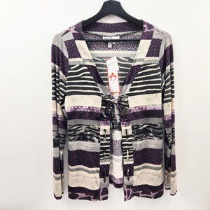 Chic and vibrant long sleeve top with an eye-catching purple print. Features a flattering tie front design. Made in Canada. Brand new, never worn.