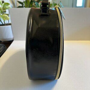 A large, black zippered makeup case with top handle branded Lancome Paris. Zipper is gold tone and the two long zipper tags are still sealed. Interior of case is lined. Note there is a small mark on inside case lid as shown in last picture.