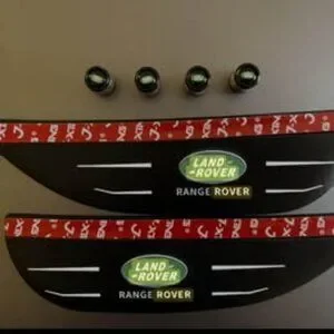 Pair of Land Rover Range Rover door sill scuff plates. Black with red and white accents and 4 stem valve covers