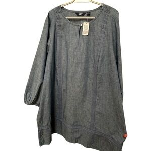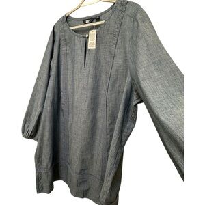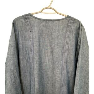 Lands' End women's long-sleeved casual tunic dress, size 2x in a chambray and lightweight 100% cotton fabric. The dress is brand new with tags and has a decorative eyelet detailing along the front panels and the hem.